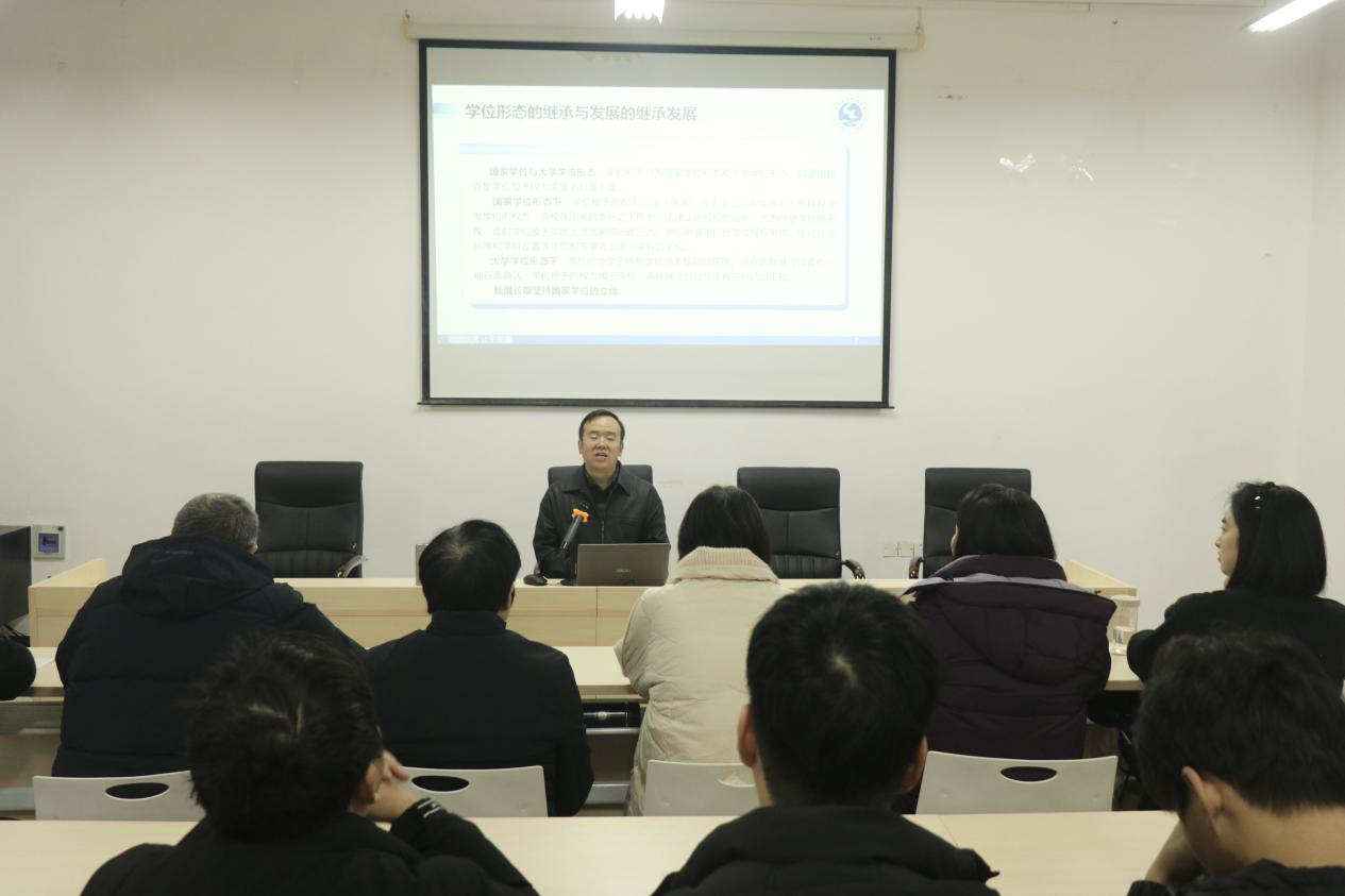 讲座中,王晋教授回溯了学位法四十余年从条例到法律的发展历程,强调其对学位授予工作的规范作用与对申请人权益的保障意义。他详解国家学位形态的坚持逻辑,解读“管理与权益并重”的立法理念,阐释“中央—省—基层”三级学位工作体制的创新价值,并深入剖析学位授权审核、授予条件类型化等制度优化举措,以及全流程质量管控与社会监督相结合的质量保障体系,并通过法律形式实现两者的分轨建设。这也为教育硕士专业学位研究生教育提供了更加广阔的发展空间和更加明确的定位。他鼓励高校充分利用法律赋予的学术自治空间,促进教育逻辑和学术逻辑在学位工作中的深层次复归,推动产学研深度融合,培养更多具有实践创新能力和社会责任感的高层次教育人才。