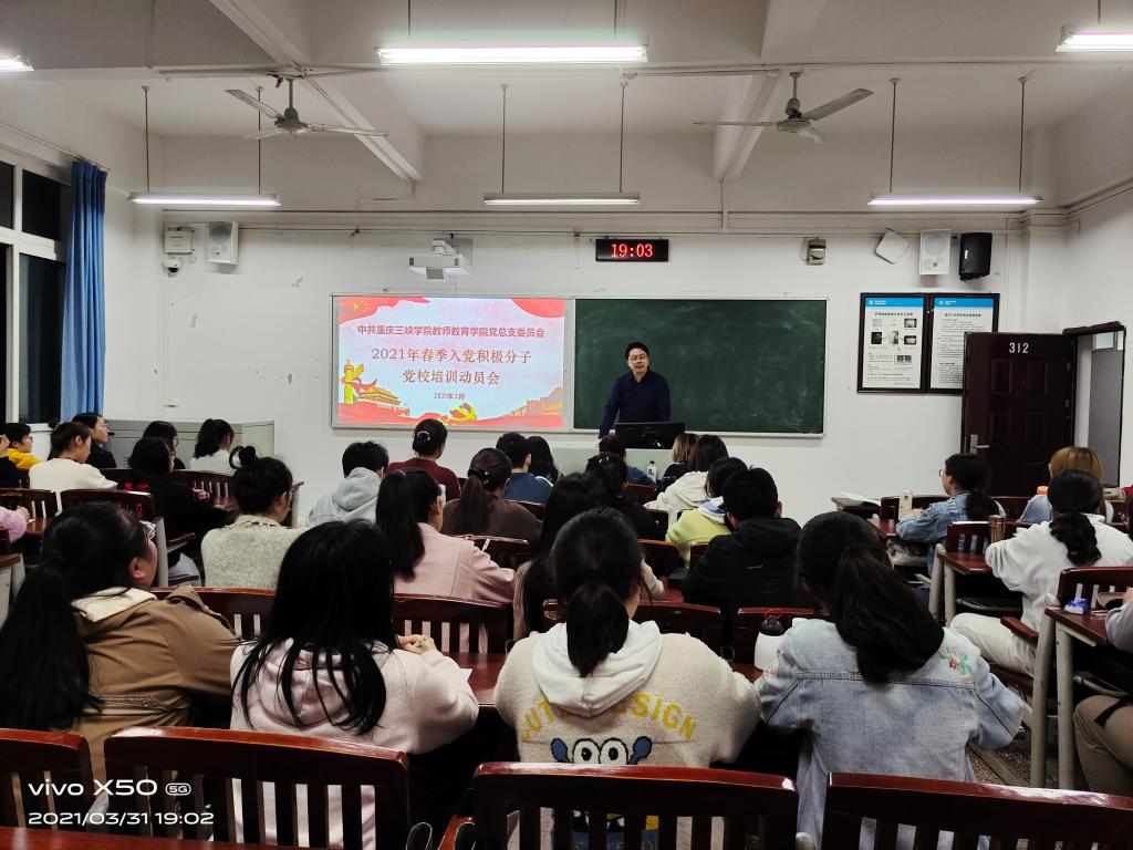 了进一步纯洁入党动机,提升对党的认识,坚定理想信念,2021年3月31日晚上7:00,明辨楼1栋312教室召开我院第77期入党积极分子专项培训会党总支书记胡秀忠担任主讲、学生第一党支部书记高曼、组织委员兼纪检委员邓峥嵘、辅导员鞠小勤列席了本次培训会