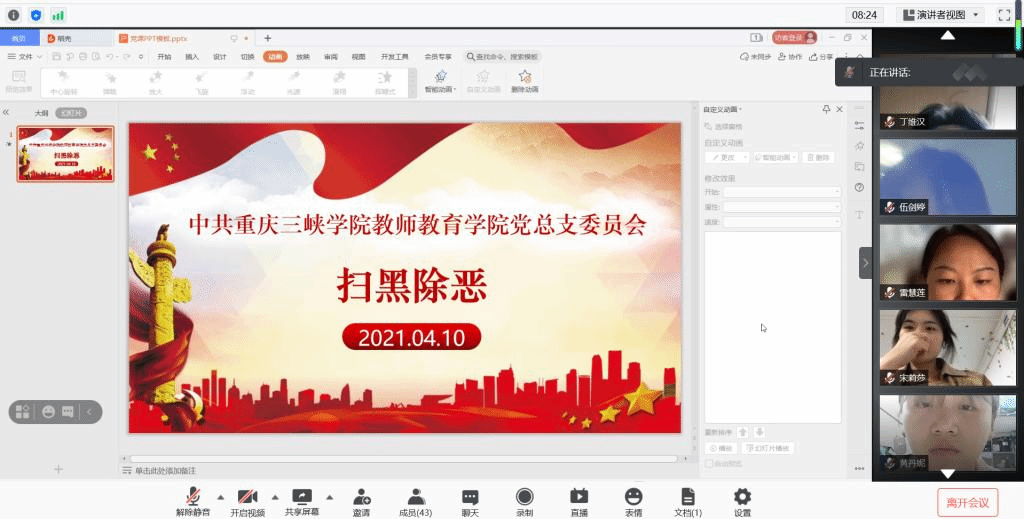 为深入学习贯彻党的十九届五中全会、中央全面依法治国工作会议中对于扫黑除恶专项斗争工作开展的决心,在全国扫黑除恶专项斗争即将收官,常态化扫黑除恶即将展开之际,betway88西汉姆联党总支委员会于2021年4月10日晚7点在线上召开以"扫黑除恶"为主题的教育活动,党支部委员会第九期拟发展对象准时参加会议进行学习。