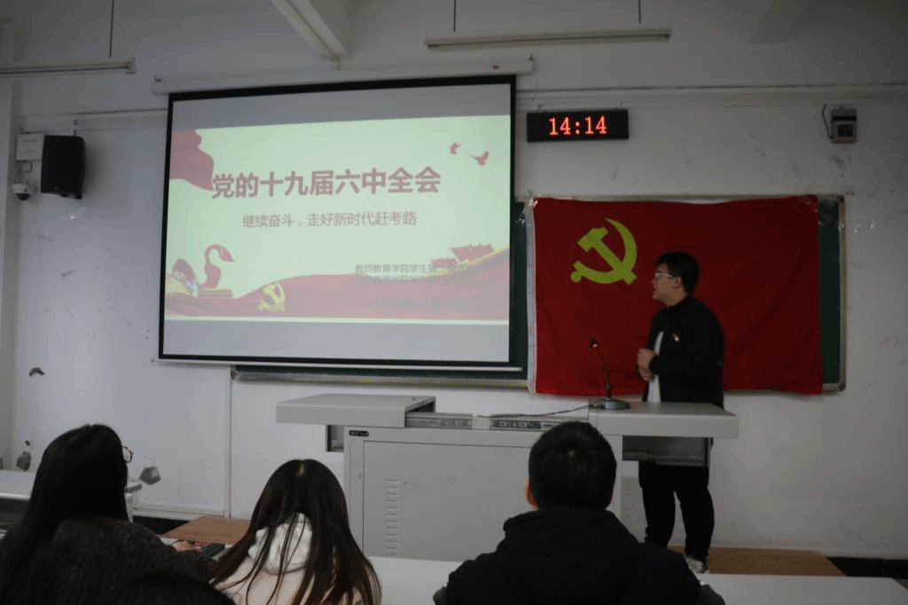 会上,学生党员、宣讲人杨坤龙围绕“重温党的十八大以来历次中央全会”、“十九届六中全会的内涵及意义”、“十九届六中全会的时代答卷”三个方面进行了详细阐述。首先,通过重温党的十八大以来历次中央全会,梳理了党历次中央全会的重点内容及重要决定。其次,介绍十九届六中全会的内涵及意义,深入了解了百年历程创造的“四方面伟大成就”、百年奋斗带来的“四方面改变”以及回答的“两个重要问题”。最后,积极响应新华社发出的倡议,要求全体党员同志现场参与“史上最难答卷”并发表自己的感想与体会。
