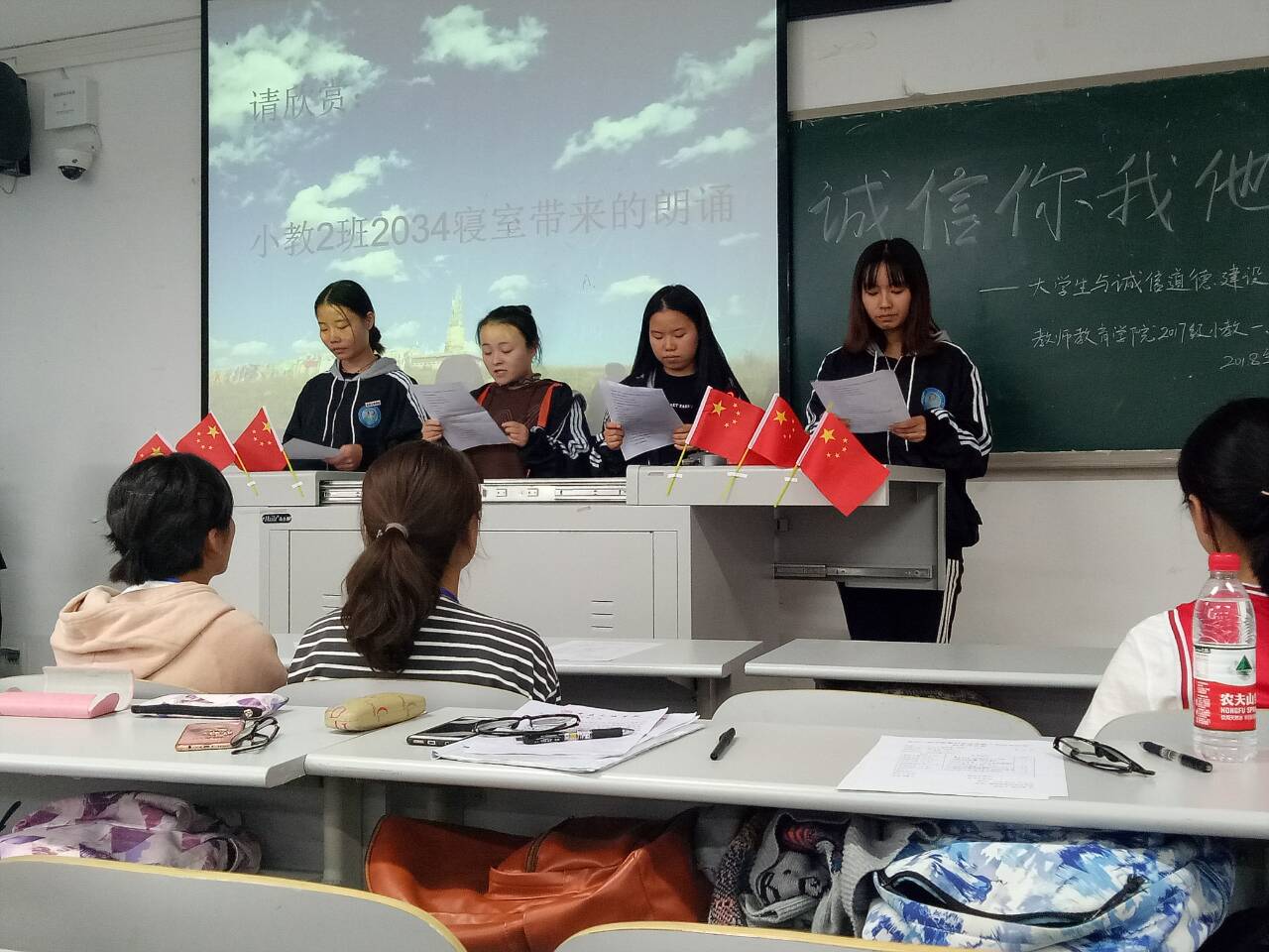 活动开始,各班以播放PPT的形式,讲述有关诚信的小故事及成语,列举了古今历史上的道德楷模,通过名人的诚信名言,向同学们宣扬诚信道德精神,发扬优良品质作风。随后2017级小学教育(师范)3班开展了提问环节,针对关于诚信的小故事以及名言来阐述自己得到的启示。结束PPT的讲述后,小学教育(师范)1、2班开始了关于诚信教育的视频宣传,同学们观看后都积极发言,阐发自己的想法。3班则播放了百家讲坛的相关诚信视频,同学们通过观看视频感触颇多。最后1、2班同学展示才艺朗诵表演,并进行了庄严的诚信宣誓。此次班会活动便在各班的宣读声与掌声中落下了帷幕。