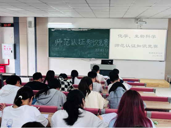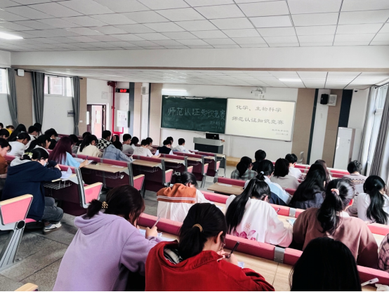 在培训会上,学院院长潘勇做了《化学和生物科学专业师范认证专家进校考查——我们应做好哪些准备工作》的报告,副院长许刚对专家听课看课等工作做了特别强调。随后,全体教师和学生进行了90分钟的师范认证知识考试和竞赛。竞赛分为填空题、选择题、问答题三个题型,经过激烈的角逐,评出一等奖4名,二等奖8名,三等奖16名。