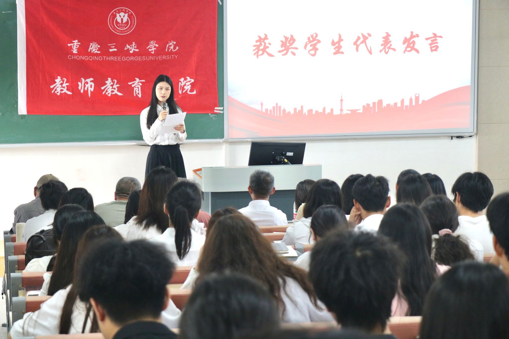 本科组学生代表刘蜜分享了参赛心得。她表示,通过比赛,自己在教学设计和课堂实践等方面取得了显著进步,并号召同学们积极参与赛事,以赛促学,夯实教学技能,为未来教育事业打下坚实基础。研究生组学生代表蔡滨临结合自身经验,强调深入研读教材、对标课程标准、以学生为中心是教师专业成长的关键。