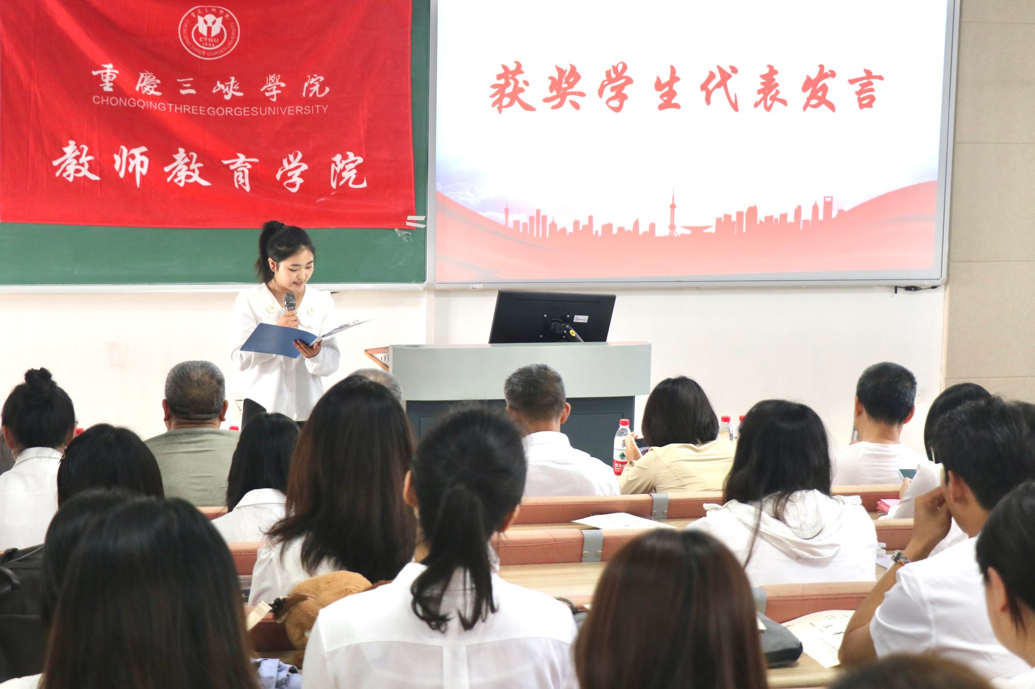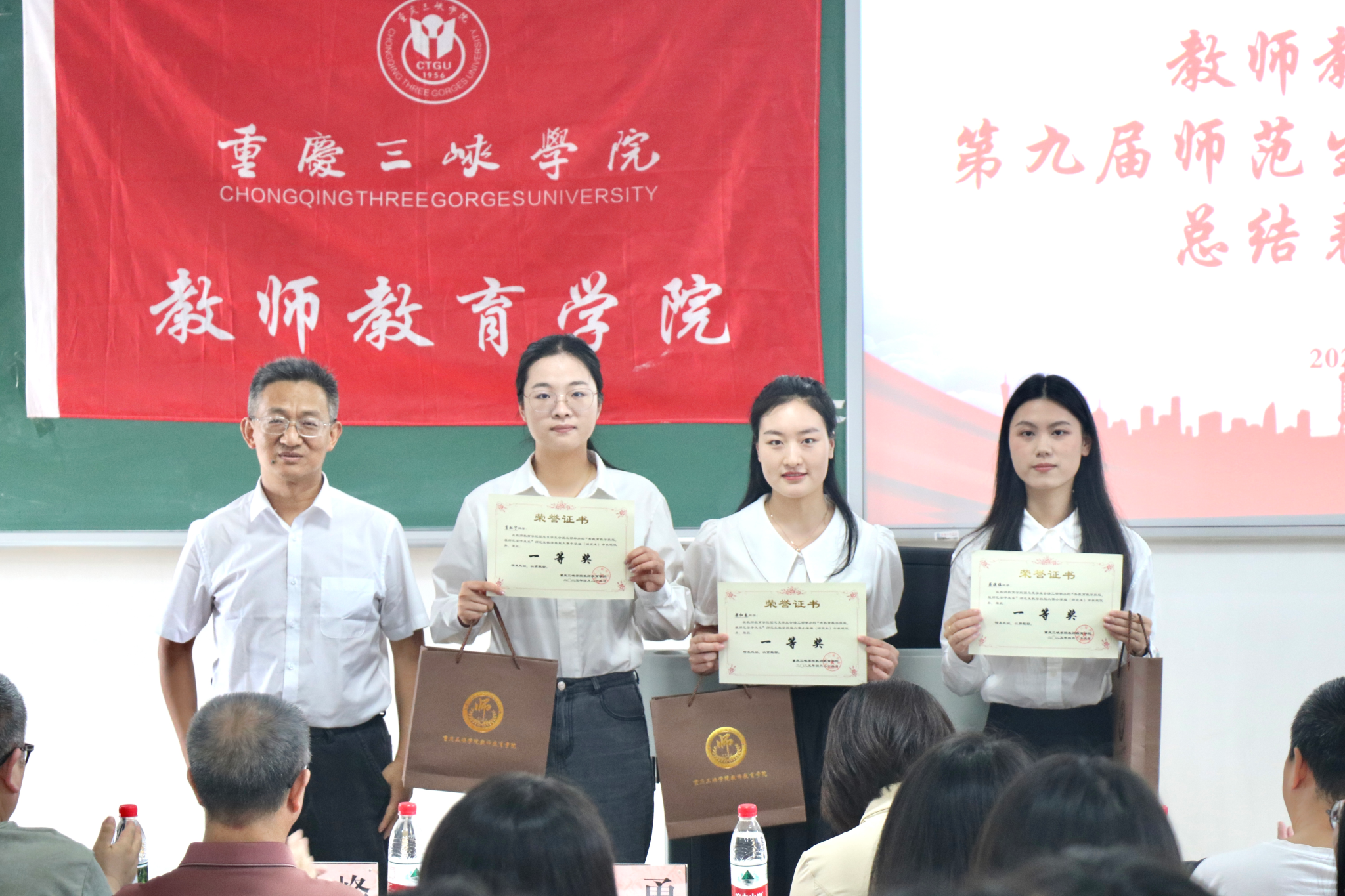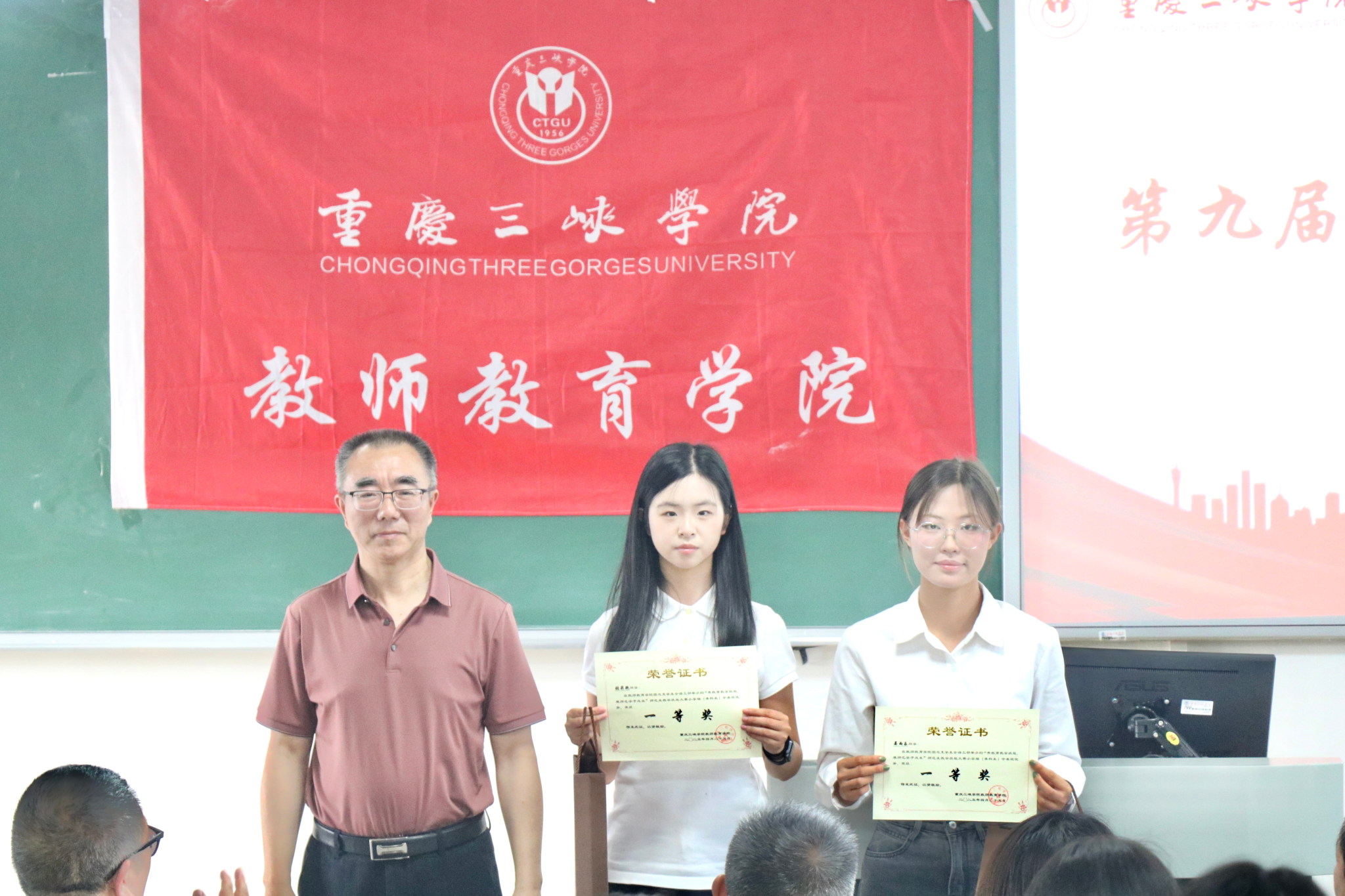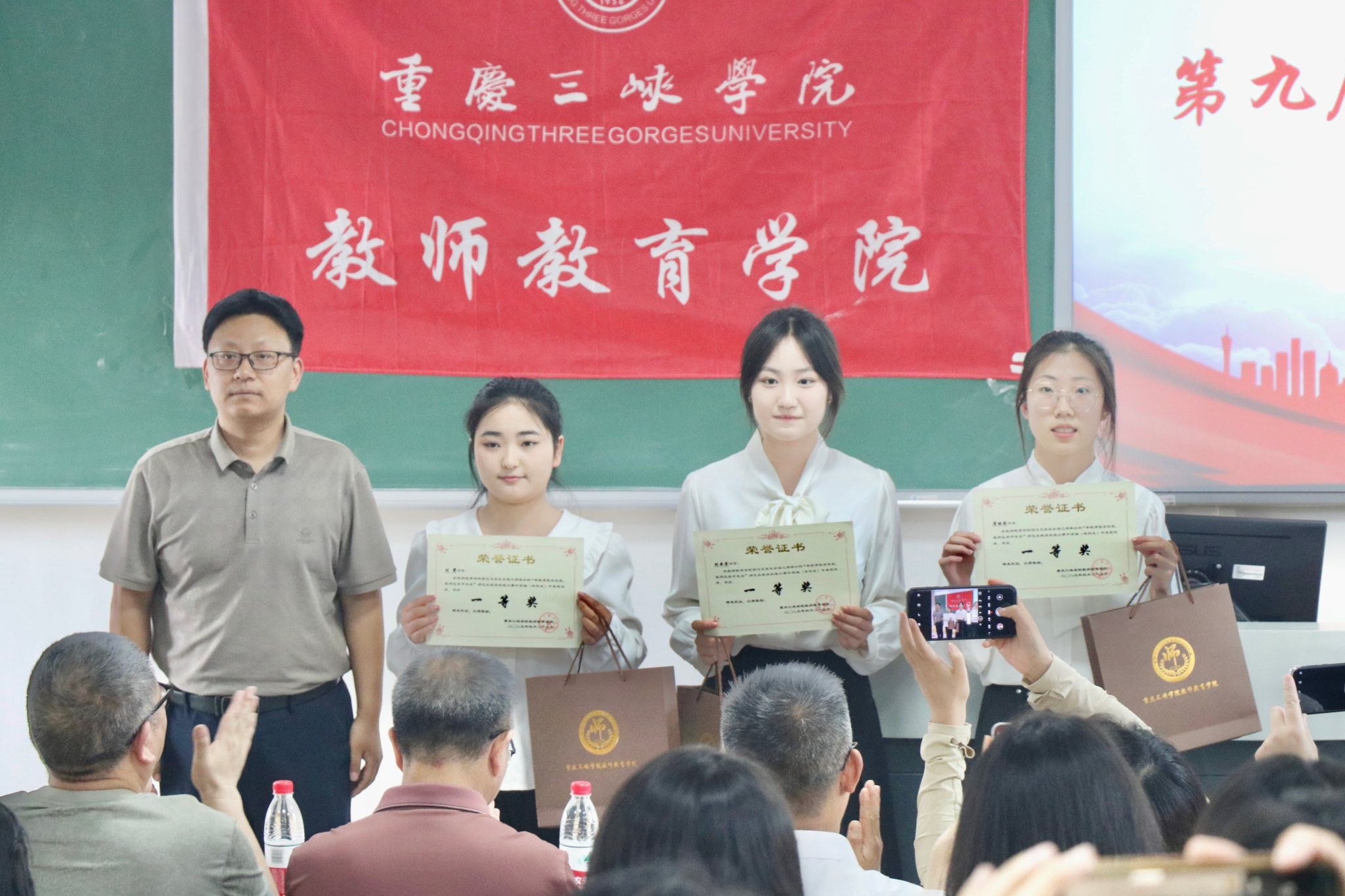 副院长蒋文峰宣读了表彰名单。本届大赛共有59名选手参赛,经过激烈角逐,48人晋级决赛。最终,小学教育研究生组和本科生组各评出一等奖2名、二等奖4名,三等奖6名;中学教育研究生组评出一等奖1名,二等奖2名,三等奖3名;中学教育本科生组评出一等奖3名,二等奖6名,三等奖9名。与会领导及教师依次为获奖选手颁发荣誉证书并合影留念。