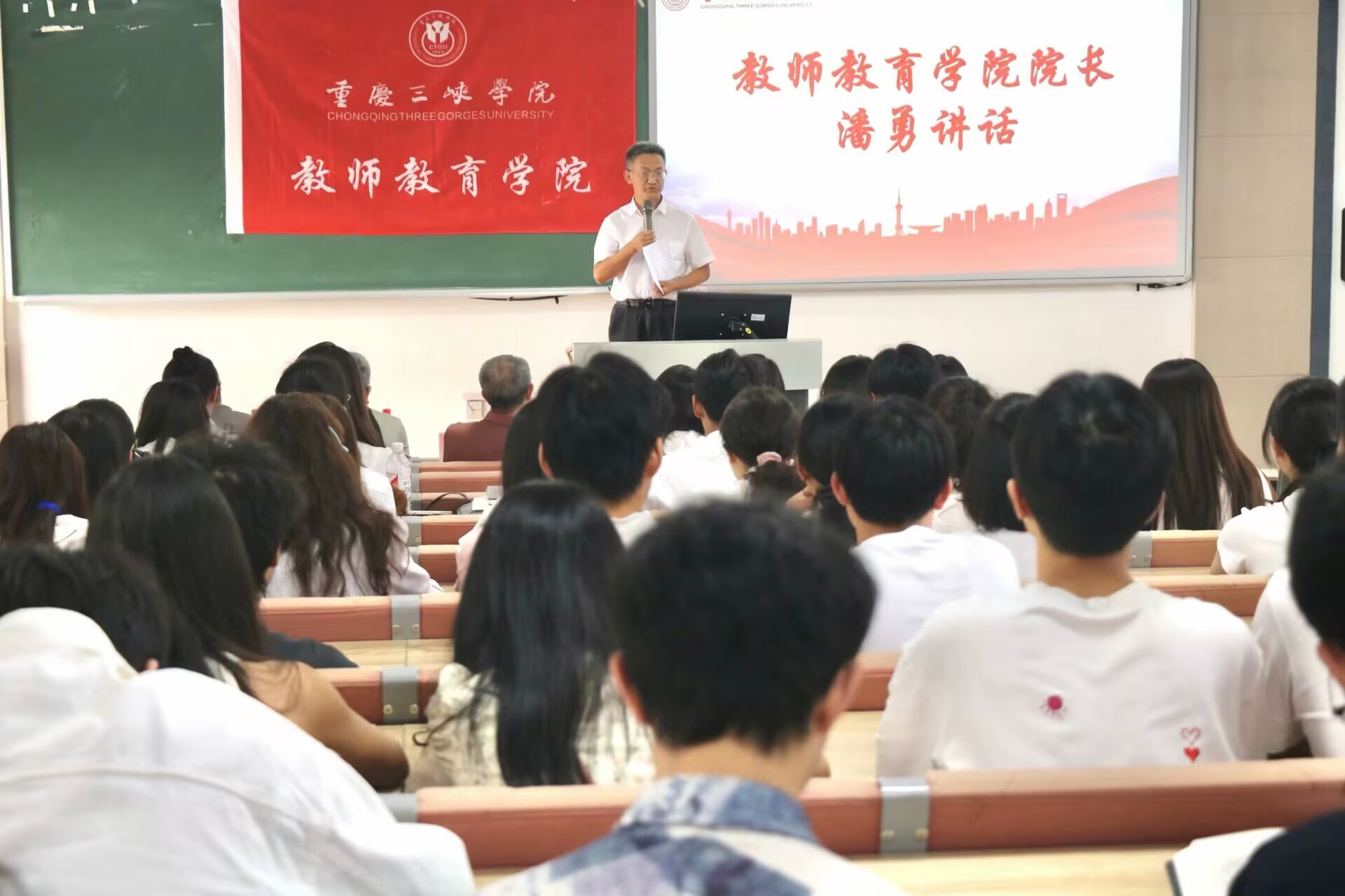 院长潘勇作总结讲话。他回顾了学院师范教育的优良传统,充分肯定了往届毕业生在教育工作中的卓越表现,并指出本届大赛通过教学设计、课程展示等环节,全面考察了学生的学科素养和创新能力,这正是新时代教师的核心竞争力。潘院长勉励全体师范生坚守教育初心,将比赛经验转化为持续进步的动力,在未来教育岗位上书写育人新篇章。