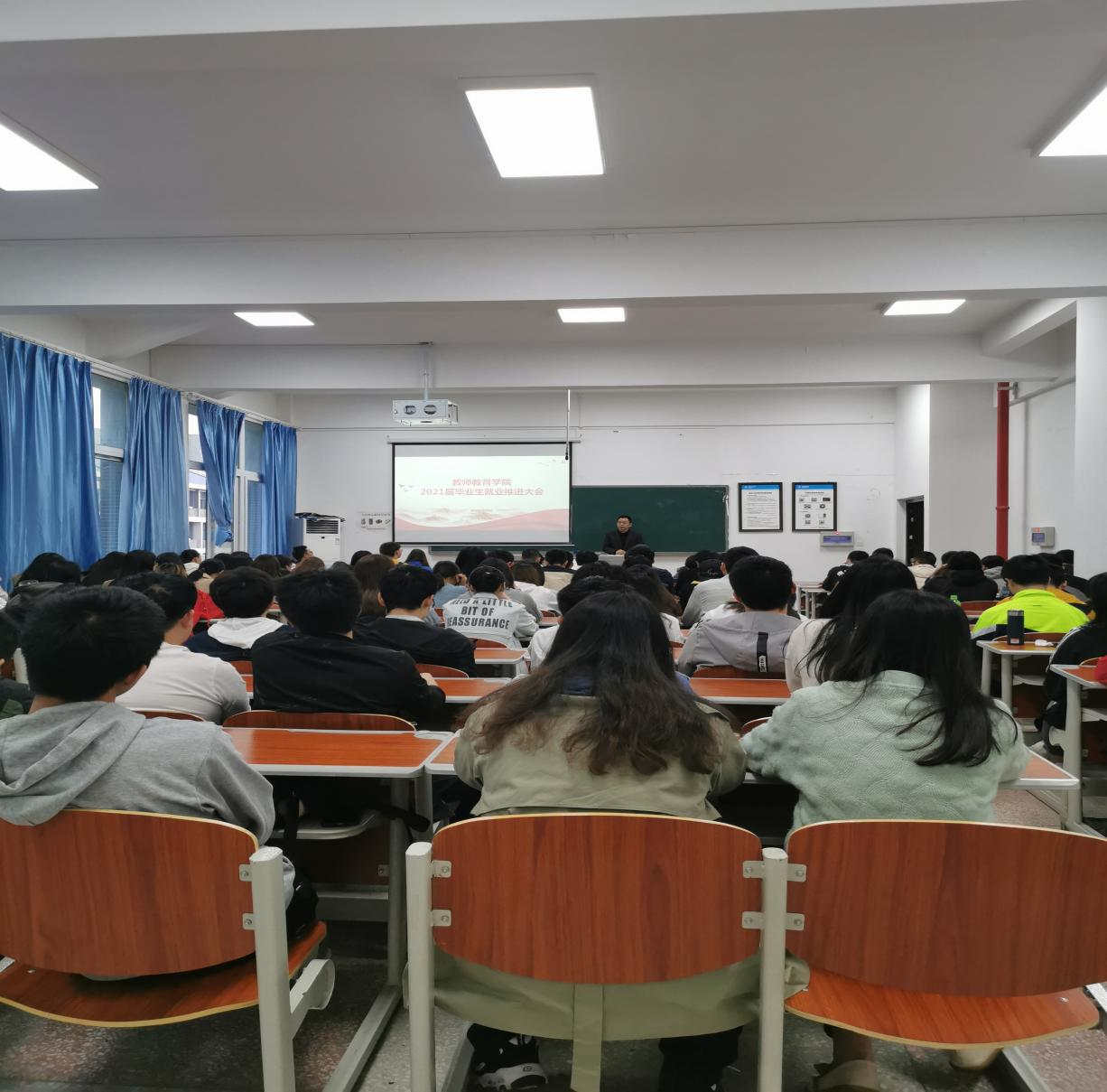 为进一步推进2021届毕业生就业工作,我院于2021年4月26日19:00在慎思楼4栋516教室召开了2021届毕业生就业工作推进会。出席会议的有我院党总支书记胡秀忠,党总支副书记李中春,学工办副主任高曼,2021届辅导员张京友及2021届物理(师范)、化学(师范)和生物科学(师范)三个本科专业的全体毕业生,此次会议由高曼同志主持。