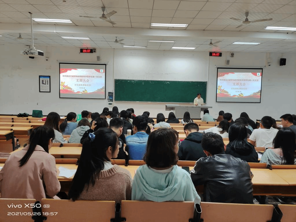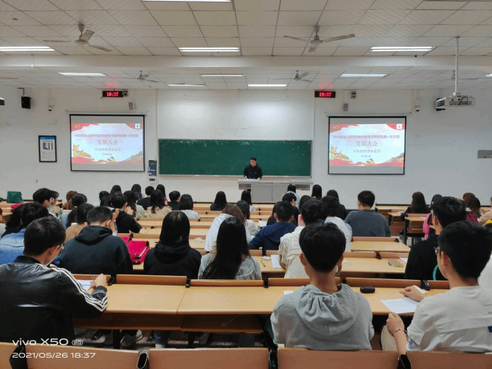 我院学生第一党支部于2021年5月26日19:30在明辨楼2栋103教室召开接受预备党员决议支部大会,对宋林滔等20名发展对象接收为预备党员进行讨论和表决,本次大会由支部书记高曼主持。