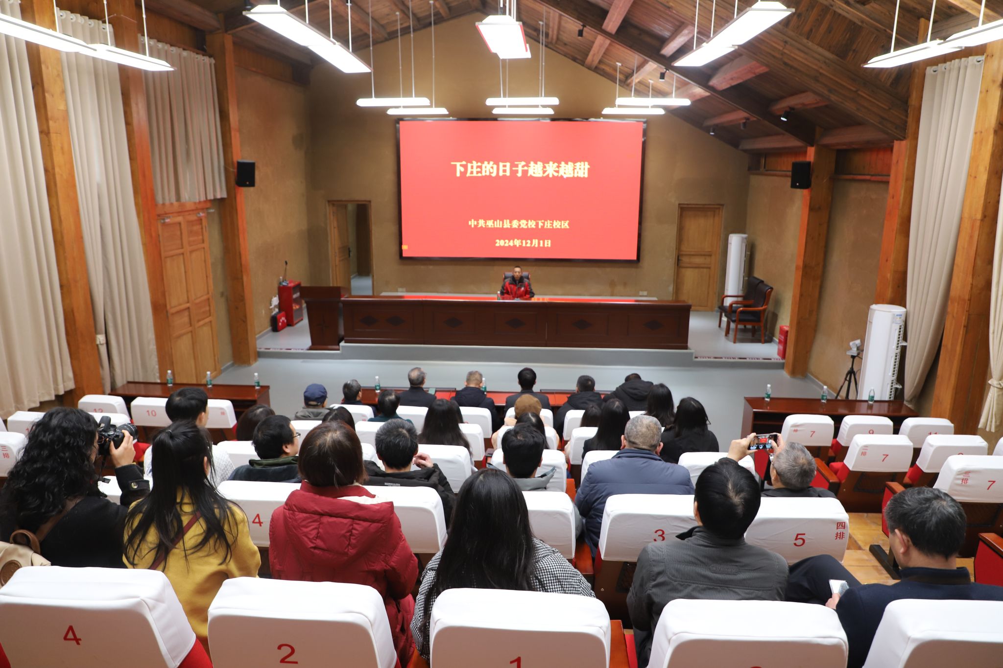 在中共巫山县委党校下庄校区阶梯教室,筑路英雄彭松仁为学院党总支全体党员讲述《下庄的日子越来越甜》。下庄村位于重庆市巫山县,是个“天坑村”。这里四面绝壁,从坑沿到坑底的距离达1100米。从1997年到2004年,下庄村党支部书记毛相林带领乡亲们历时7年,6人付出宝贵生命,在绝壁上一锤一凿修通了长8公里通向外界道路的“天路”。这条路,从“出山路”到“致富路”,让下庄村乡村振兴路越走越宽,村民的生活越来越幸福。他们用生命和汗水谱写了挑战封闭、贫穷与落后的悲壮诗篇,创造了“不甘落后、不等不靠、不畏艰难、不怕牺牲”的下庄精神。