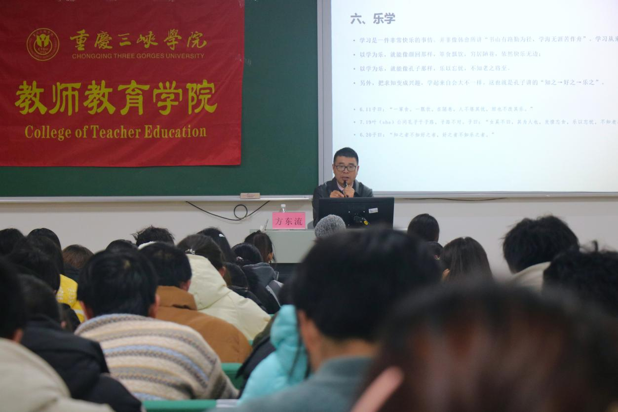 2024年12月26日下午2点,betway88西汉姆联于博学楼1栋201成功举办了一场以“读《论语》,悟学习之道”为主题的学术讲座。本次讲座由重庆树人教育研究院中学研发主任、重庆国学学会常务理事、中国作家协会会员方东流老师为主讲,betway88西汉姆联副院长许刚主持,一百余名学生参与。