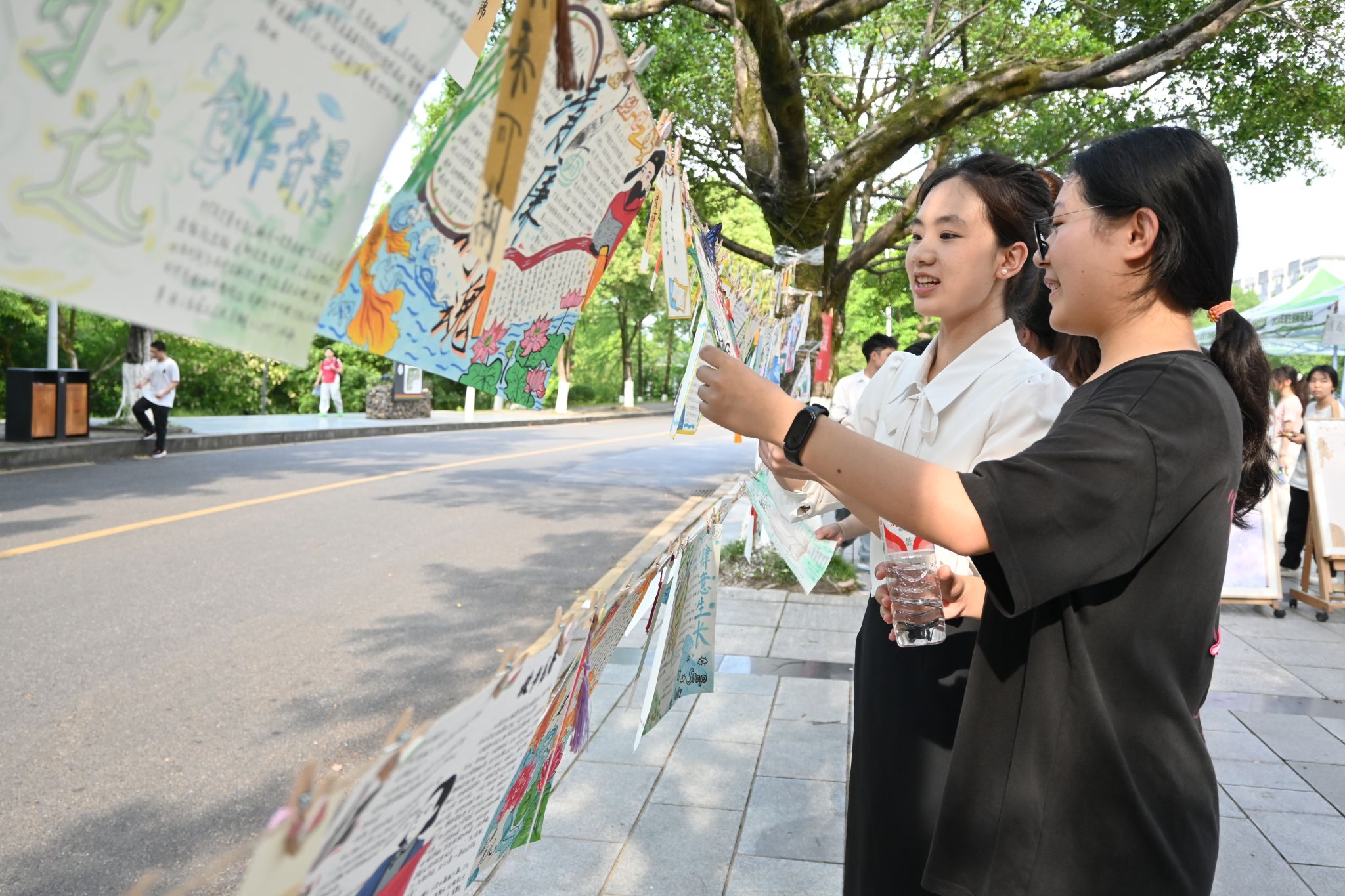 此次成果展现场共展出读书笔记、思维导图、读后感、手抄报、演讲视频等150余件学生学习成果,展现了学生们在读书节中的收获与思考。在互动区,同学们热情高涨地参与到“字里探秘,阅影猜魂”的人物竞猜中,体验“诗韵球趣,逸彩校园”的颠球背诗乐趣,动手参与“巧手塑古,慧眼识文”的黏土捏字活动,并在“墨香心语,评海泛舟”的书评漂流中分享阅读感悟。