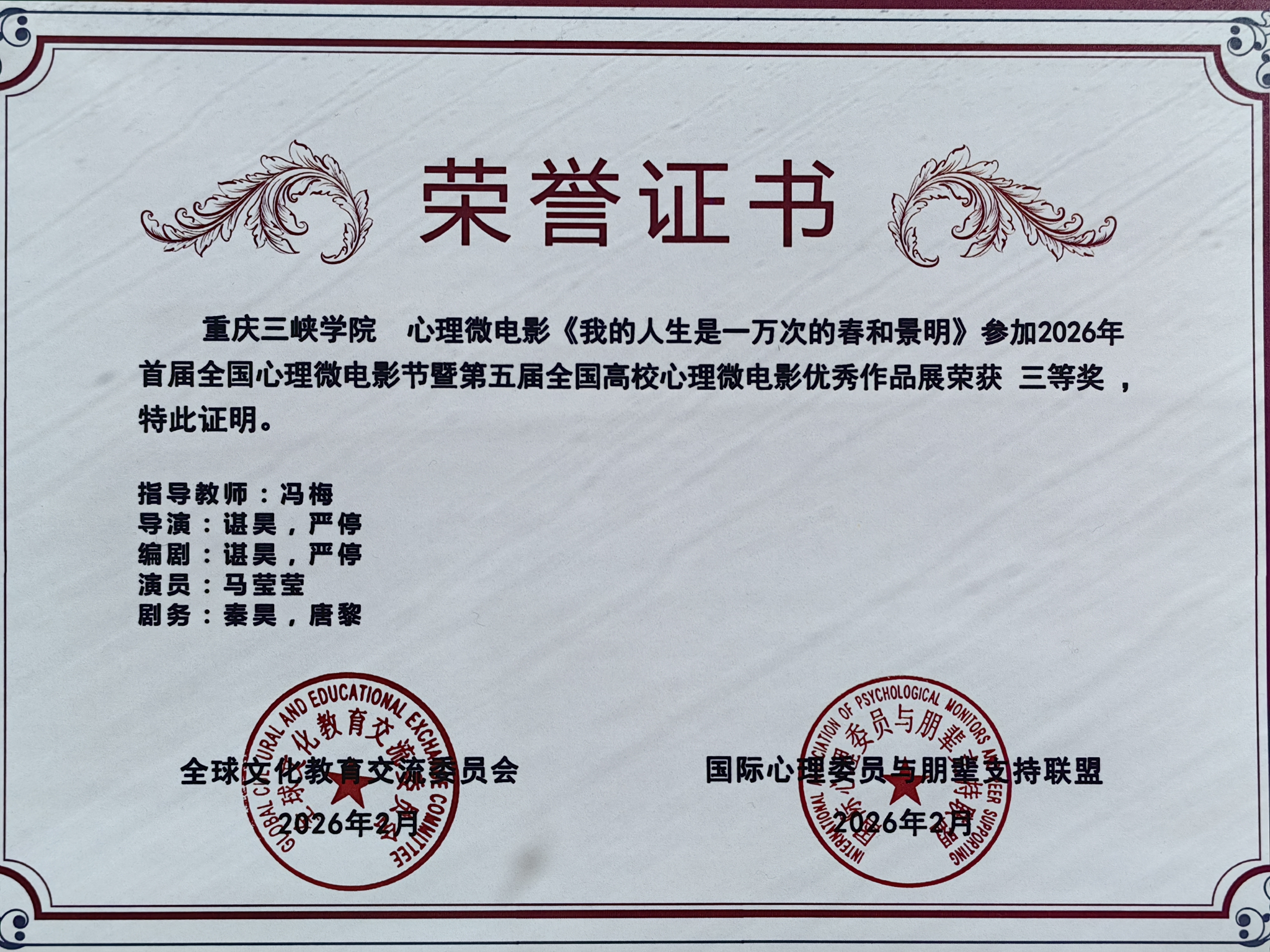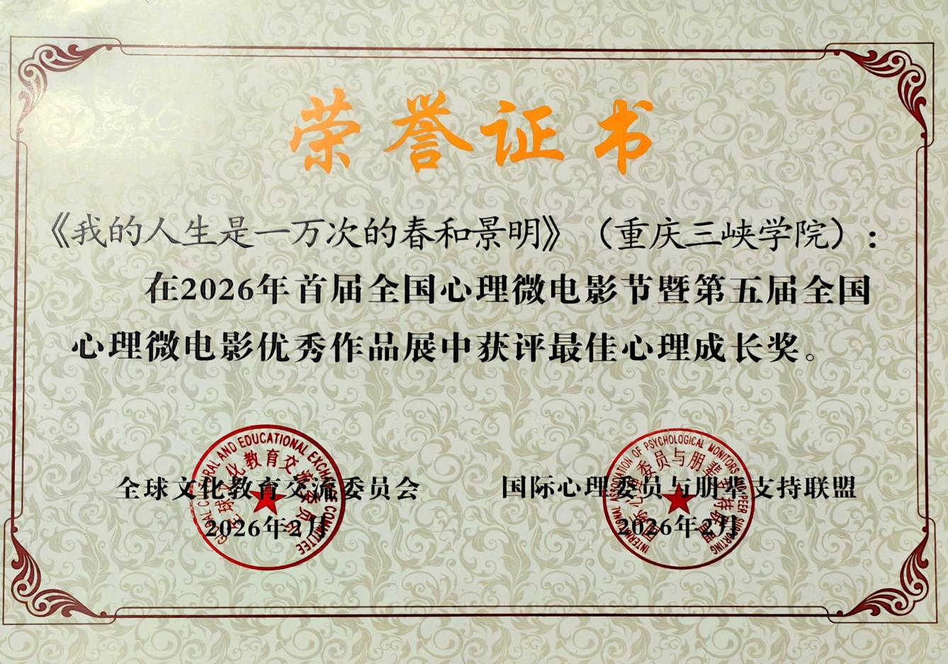 2026年2月6日至7日,首届心理微电影节暨第五届全国心理微电影优秀作品颁奖仪式在深圳举行。由betway88西汉姆联心理专干冯梅老师指导,2023级学生谌昊担任主创的心理微电影作品《我的人生是一万次的春和景明》荣获大赛三等奖,并荣获最佳心理成长奖。
